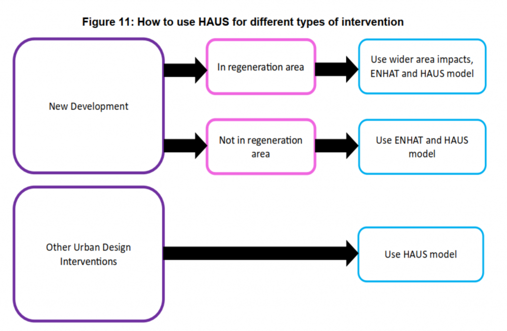 The guide already had advice on valuing the health and rough-sleeping impacts of additional rented affordable housing. The new bit this time is the ‘HAUS’ methodology for valuing a wide range of health impacts from new developments or urban design interventions. There’s some overlap with the transport scheme impacts covered in TAG, but HAUS comes from a different angle on these, as well as covering other areas such as other community infrastructure or building design. A pair of case studies about using this methodology has also been produced.
