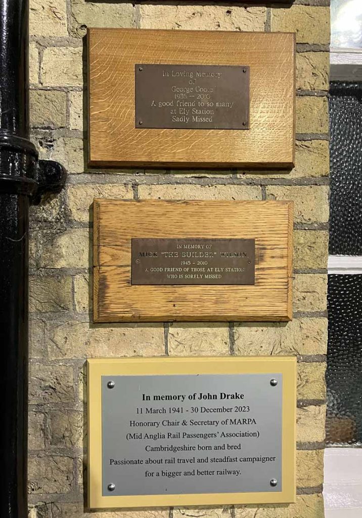 Ely, the Crewe of the Fens. (In fact, Crewe is the Ely of Cheshire.) This year is Railway 180 in Ely. It’s one of the most human places on the railway. The staff pride themselves on their manual announcements, and there’s a gardening group. The waiting room has a book exchange, and photos of trains. The postbox on platform 1 has a railway-themed yarn topper. The Christmas tree isn’t as magnificent as last year’s. But the coffee counter is open. Mr Greater Anglia comes onto the platform with a last call for the direct bus to Stansted Airport. A Network Rail inspection train growls past platform 3.